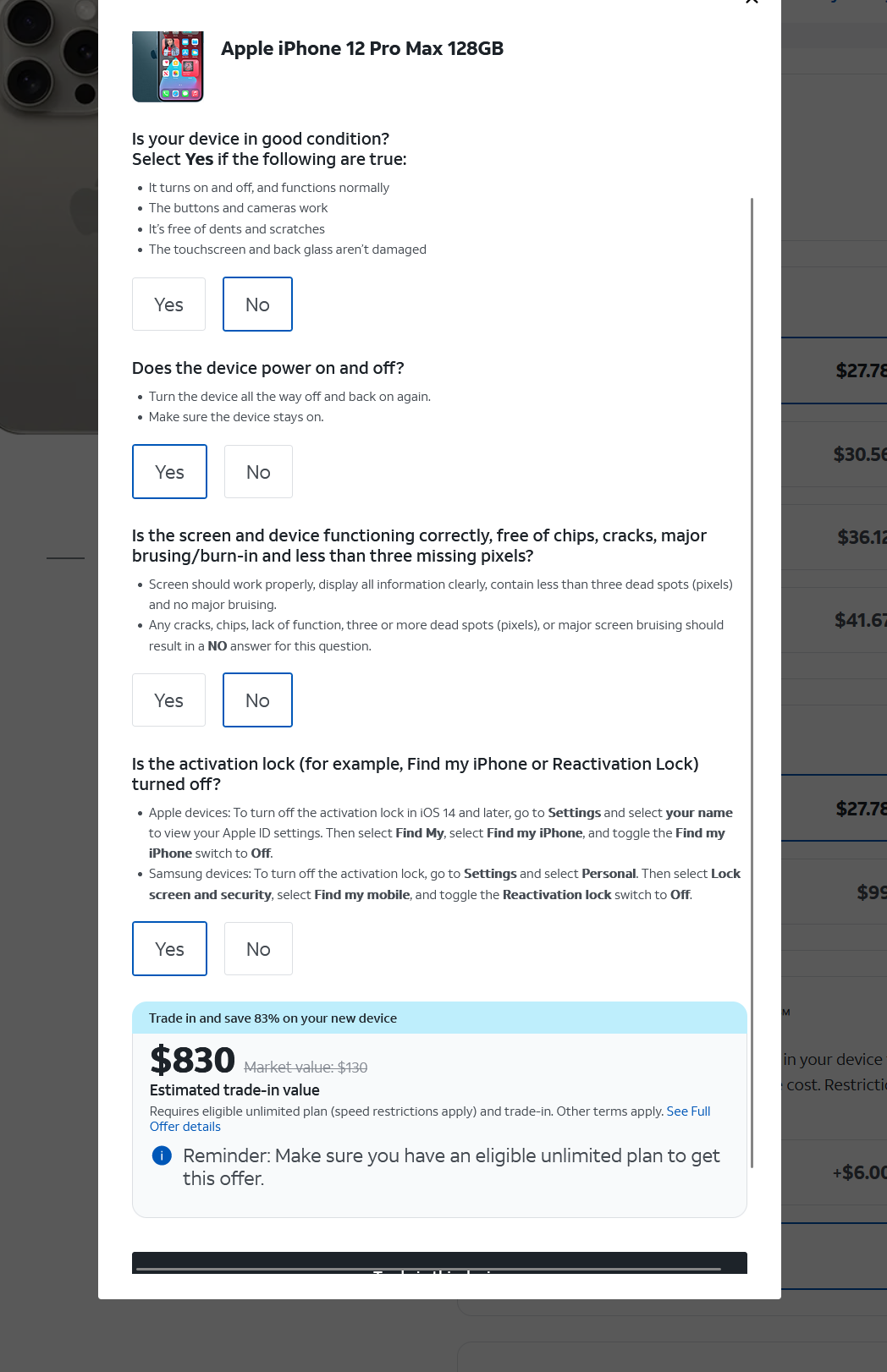 Question #3 on A&T's site is tricky... Is says "Is the screen and device functioning correctly, free of chips, cracks, major brusing/burn-in and less than three missing pixels?" and then proceeds with subbullets only related to the screen (seemingly). I believe the correct answer to #3 (if you have a cracked back) is actually going to be NO, which brings the value of the 12 Pro Max down to $130 (so just barely in the $830 credit tier).