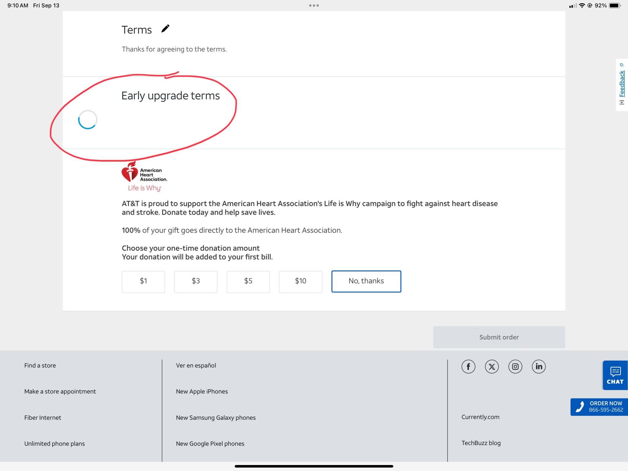 I’m stuck at “Early Upgrade Terms” getting the death spin. I know I paid for the “Next” program to upgrade early. Been on hold for an hour with ATT. This has never happened to me before.Ok, all good...cleared my cart and tried again, this time it worked.