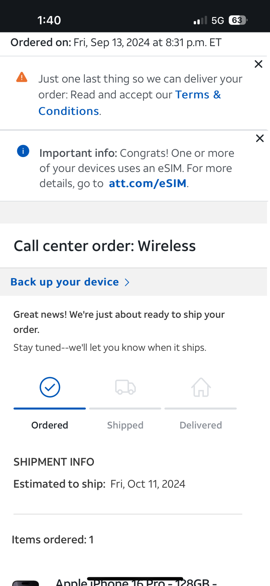 Yep you got a configuration that was still in the initial inventory. @fel10 went with the Black on Friday which appeared to be more popular or AT&T had less inventory for the Pro Max 512 Black configuration.Well, I ordered the IPhone Pro Max Desert Titanium 512GB today around 2 pm PST and mine is showing it will be delivered on launch day. It says scheduled to ship on 9/18. Every other choice said Sept. 30th or after.