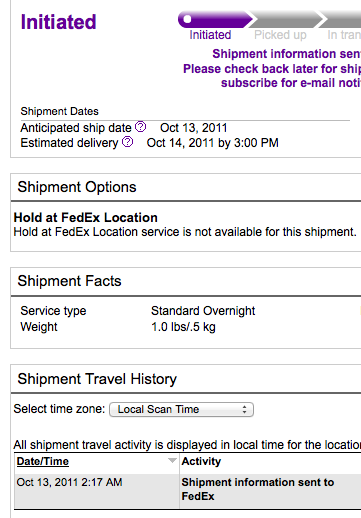 FedEx is holding my stuff. I can't wait to see it released for shipment today. Should be at my door by 3PM tomorrow. Hopefully not that late!