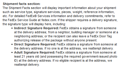 This is directly from FedEx's Help menu in the shipment tracking area. So according to them, if you do not have anything in the Shipment Facts section regarding signatures, then a signature won't be required.