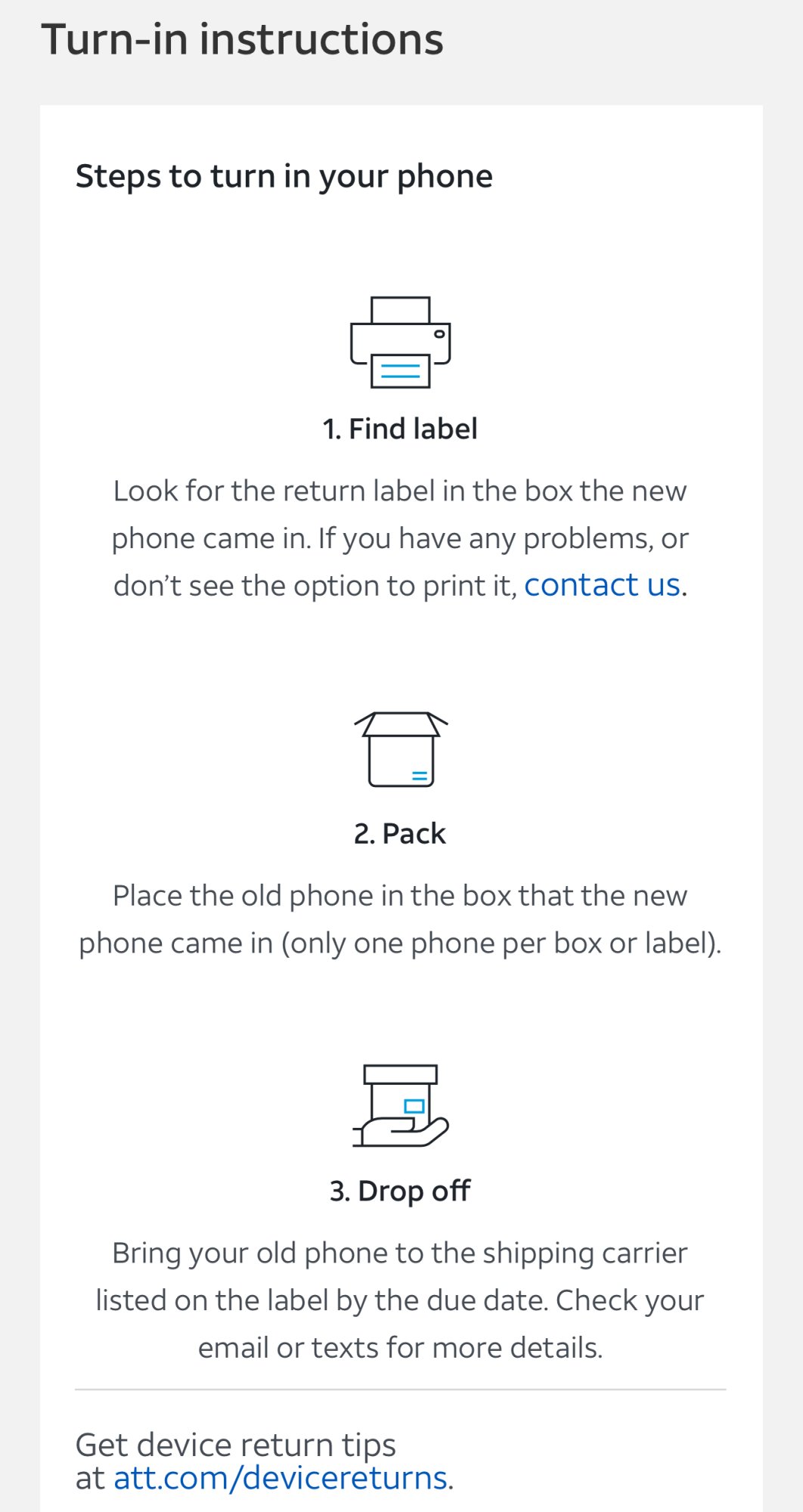 That’s incorrect the return kit for AT&T direct orders has always been included with the new phone package to include a return label for the trade in case phone.