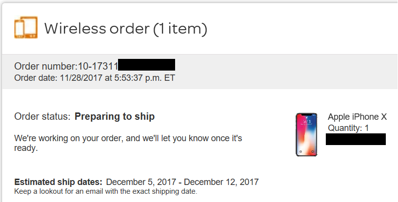 My company's phone guy ordered my iPhone X 64GB Space Gray yesterday through AT&T Premier 11/28 about 6PM Eastern, with an estimated ship date of 12/5 - 12/12. After about an hour the status changed to "Preparing to ship". The order number starts with a 10. Hopefully this means the estimated ship date is very conservative. But judging from what I've read in this thread, maybe not.