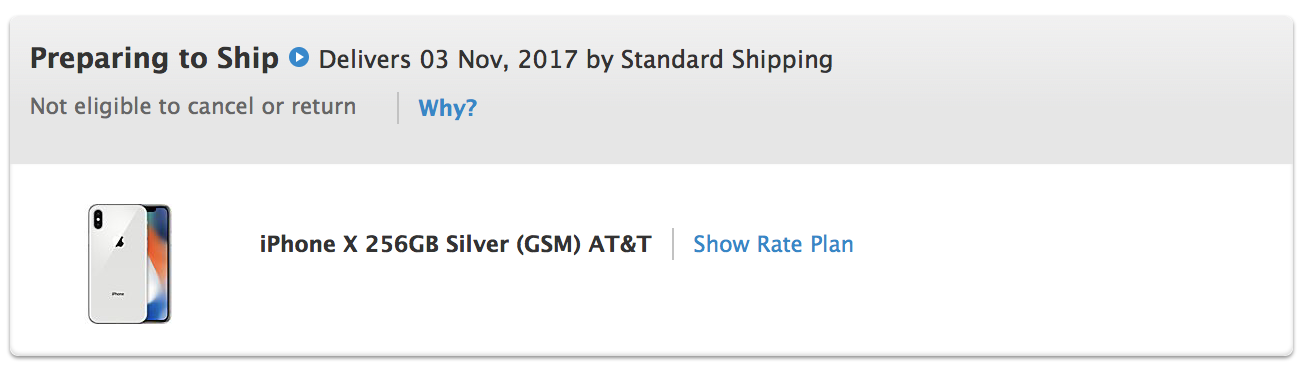 Because nothing is really processed until it is. Apple doesn’t pull the upgrade until it’s getting ready to ship. I am becoming more optimistic that ATT will come through as my upgrades are processed when I go into them and it says to pay the 1199 to upgrade. I also have gotten two emails with the date of 11/3. We also got a text message this morning that our orders are almost ready to ship. Once I get a confirmation I will cancel apples order. 2-3 weeks out for that one and again they won’t process anything until it gets close to ship.