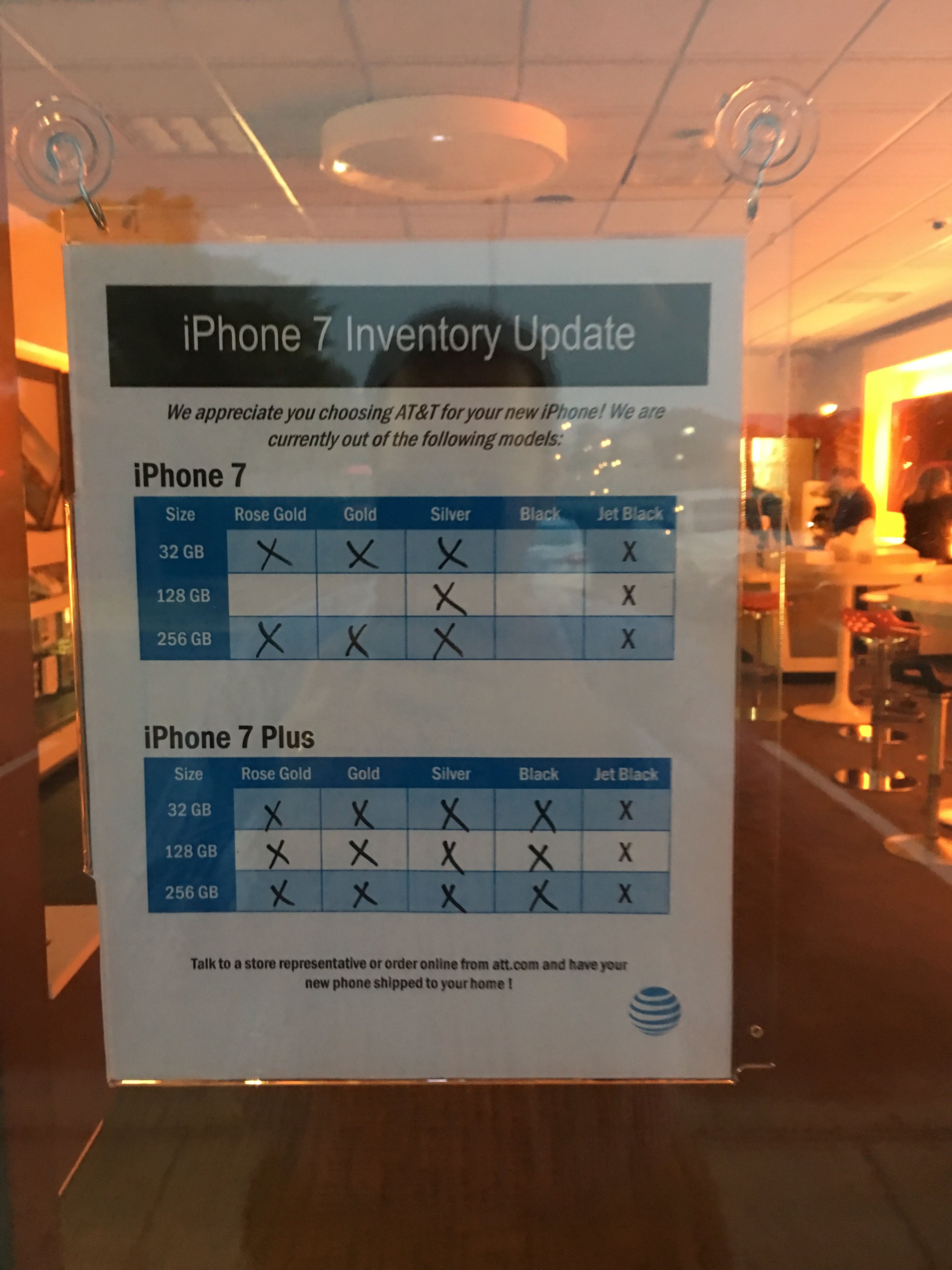 Just called over 6 AT&T stores here in NJ. All of them said they have NO iPhone+ available....Only ONE store said they have one 32gb Black Plus.... Fml... Do I camp at the local apple store (prob people camping out right now) or wait for my Oct pre order? I know Apple has the best chance for walk ins but it's just so risky to waste my time.. I have multiple friends that work at the local Apple store and still can't get any help hahah Qhshfocnakdbejak IDK !!