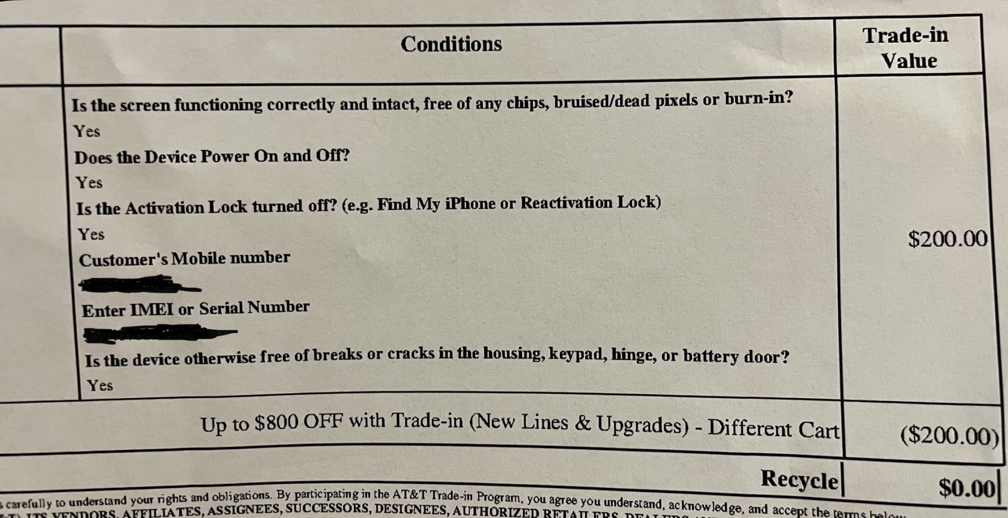If CSR doesn’t help just go back to the store and have them make a copy of the plain paper trade in receipt that many of us got. You should have signed that form in the store and they can make a copy of ot or reprint a copy for you.Wish I got something close to this. I just got a receipt with not much on it. I'm trying to clarify with ATT CSR now to make sure its all good. I'm paranoid.