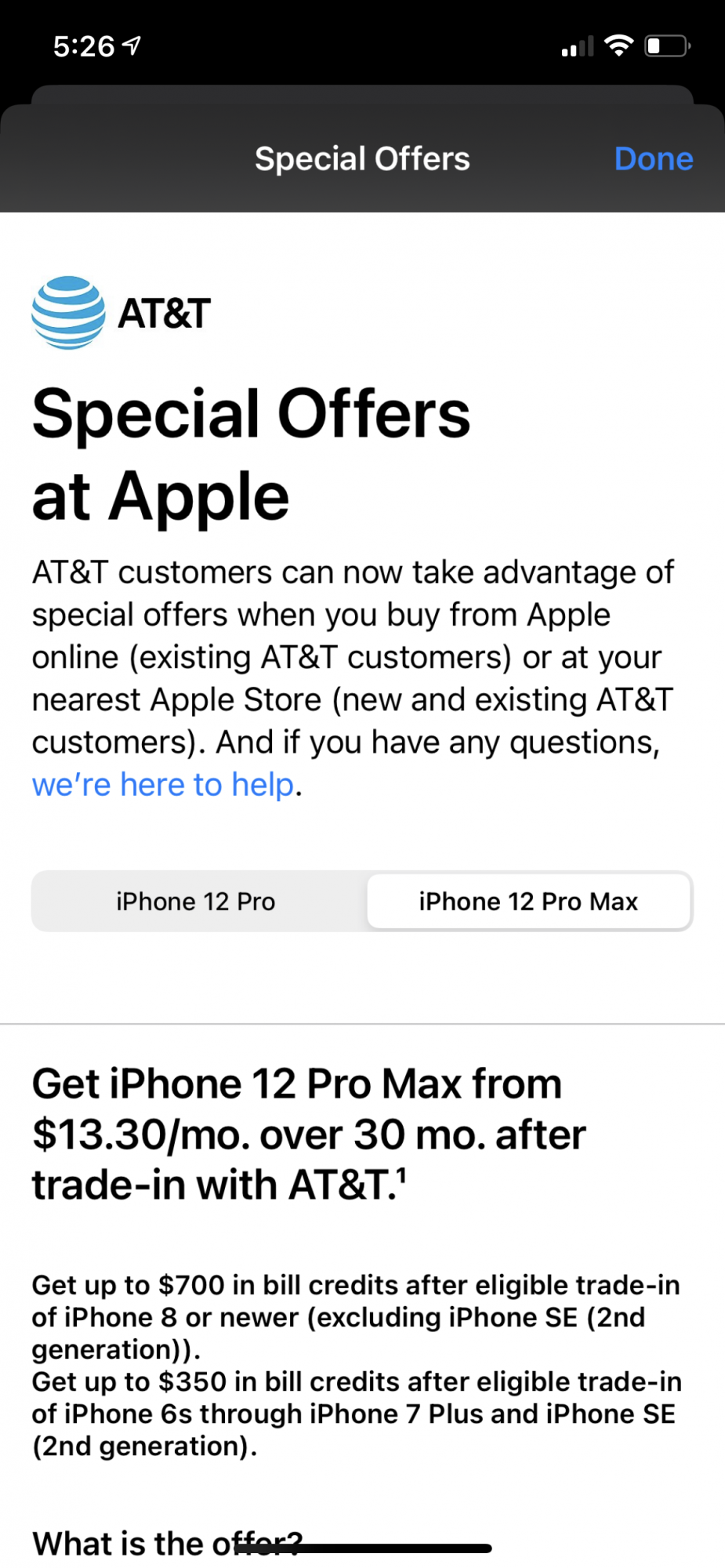 1. AT&T Special Trade-In Offer: Monthly Price reflects net monthly payment, after application of AT&T trade-in credit up to $800 (for iPhone 12 or iPhone 12 Pro) or up to $700 (for iPhone 12 mini or iPhone 12 Pro Max) applied over 30 months after trade-in of eligible smartphone with min. $95 trade-in value. Requires upgrade of an existing line (or activation of a new line in stores) and purchase of a new iPhone 12 mini, iPhone 12, iPhone 12 Pro, or iPhone 12 Pro Max on qualifying 30 month 0% APR installment plan, subject to carrier credit qualification. If buying on the AT&T Installment Plan with Next Up, customer is responsible and will not receive any credits for an additional $5/mo. for the Next Up upgrade feature. $0 down for well-qualified customers only, or down payment may be required and depends on a variety of factors. Tax on full retail price due at sale. Requires activation on eligible unlimited plan (visit