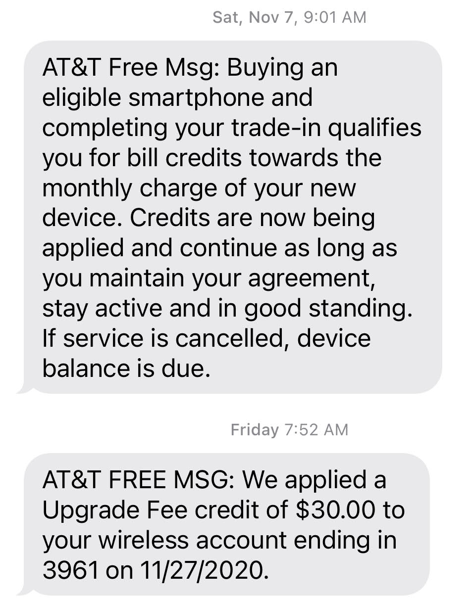 FYI, I didn't get any text regarding the credit/promo, lengthy or not.Once the phone is received and processed at the 3rd party warehouse, you'll get a lengthy text saying that the credit/promo will be applied. It's written in a very confusing way, most likely by monkeys. You won't get any other confirmation until the bill is generated.