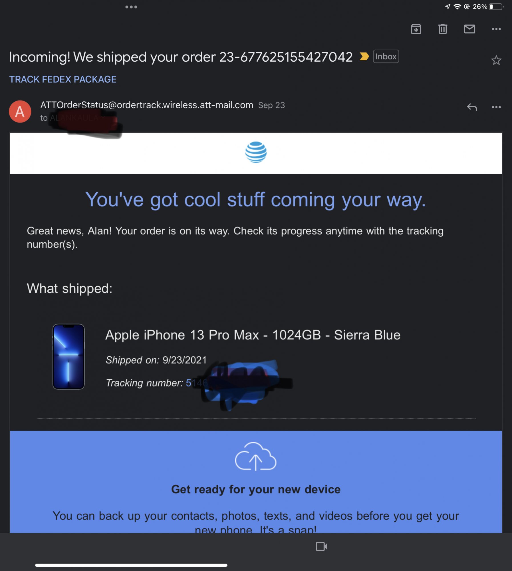 1TB Sierra Blue PM here - ordered at 7:58am. Got a shipped email from ATT 9/23 at 11:31 Saying its shipped overnight from Ingram Micro in Indianapolis, for delivery to NYC by 8pm 9/24, with the fedex tracking #.