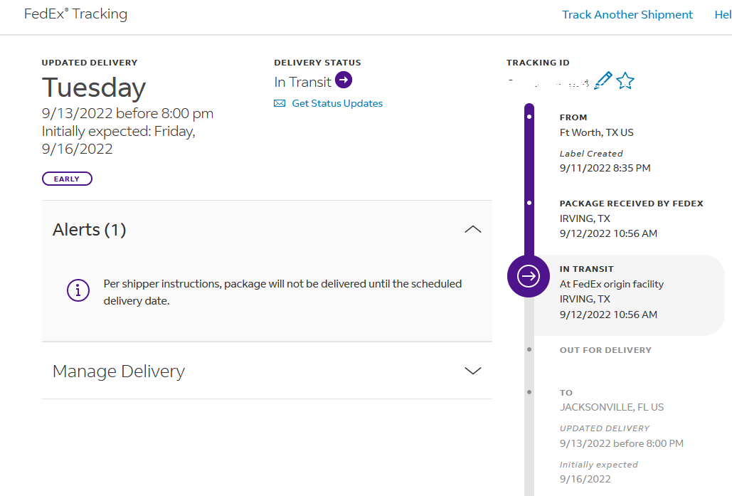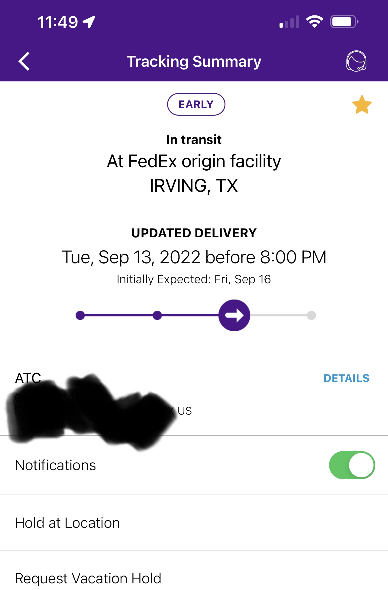 If you look on the FedEx website, there is a note that says that it won't be delivered until the 16th. "Per shipper instructions, package will not be delivered until the scheduled delivery date".View attachment 2057906I haven’t gotten an actual tracking number but my ability to cancel for one of my phones went away. I also found tracking in my FedEx manager and there was a package from ft. Worth that’s supposed to be delivered 9/16. Today, I got a message that it’s expected earlier from 9/16 to 9/13. It may just be my trade-in return box, but usually att sends the return information in the same box the phone gets shipped.