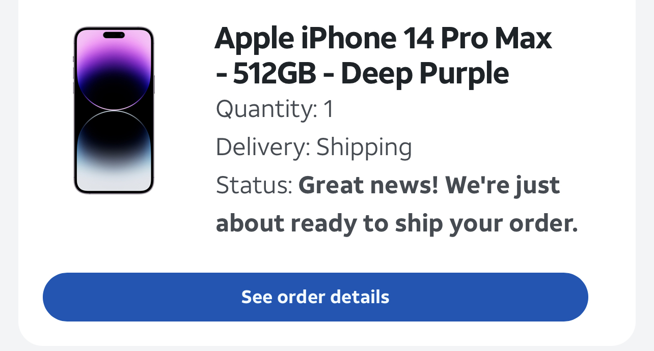 I just got the "Great News We're Just about ready to ship" message! 14 PM 512 GB purple