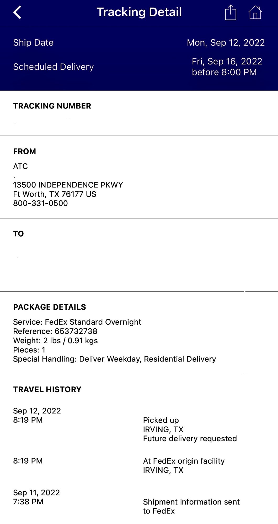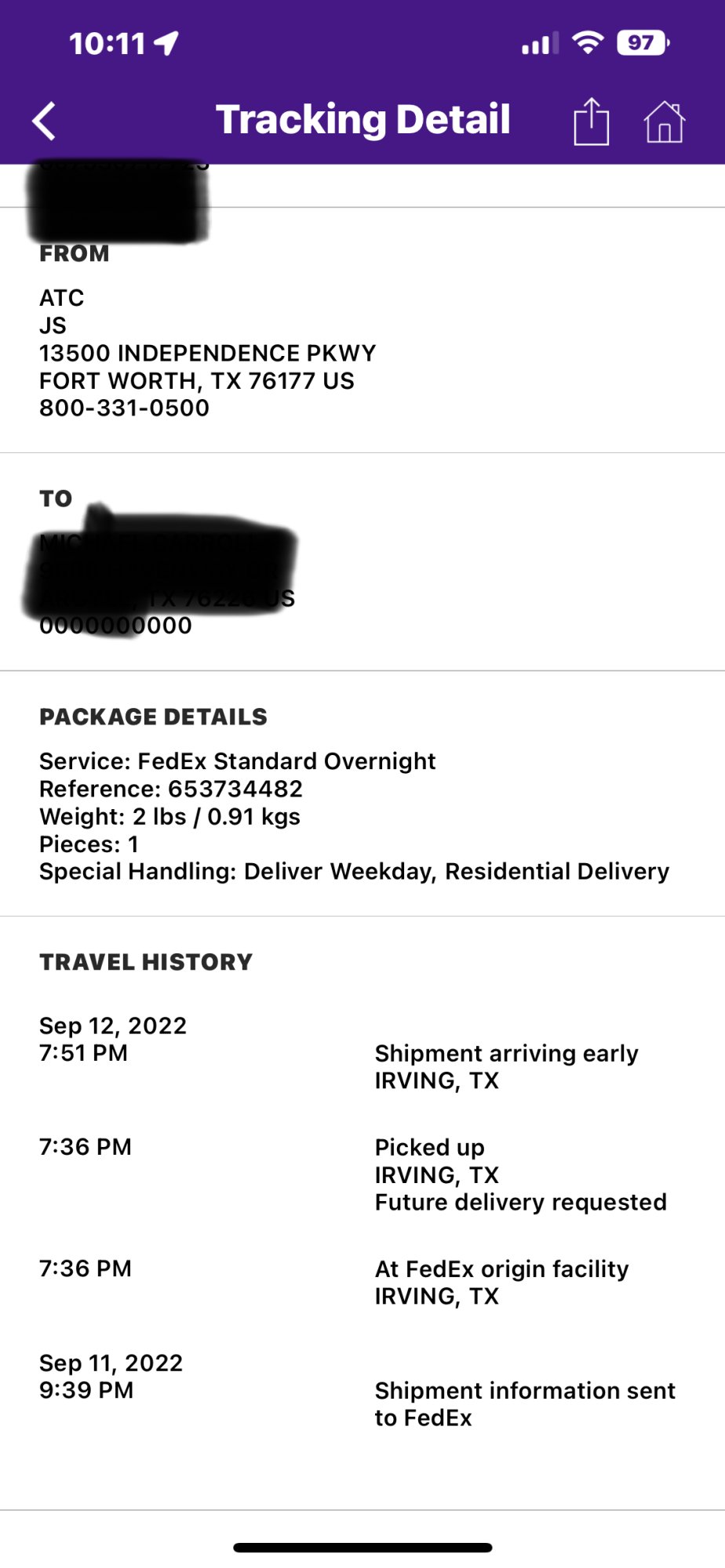 2lbs here, but coming from Indiana. Originally showed scheduled for 9/16, but now showing end of day 9/13. Got the notification from FedEx, but ATT site says waiting to ship. So I guess we'll just wait and see what happens.My package from Fort Worth is 2 lbs, that’s not a trade in kit. Last couple years trade in kit comes after delivery of new phone - which makes sense.