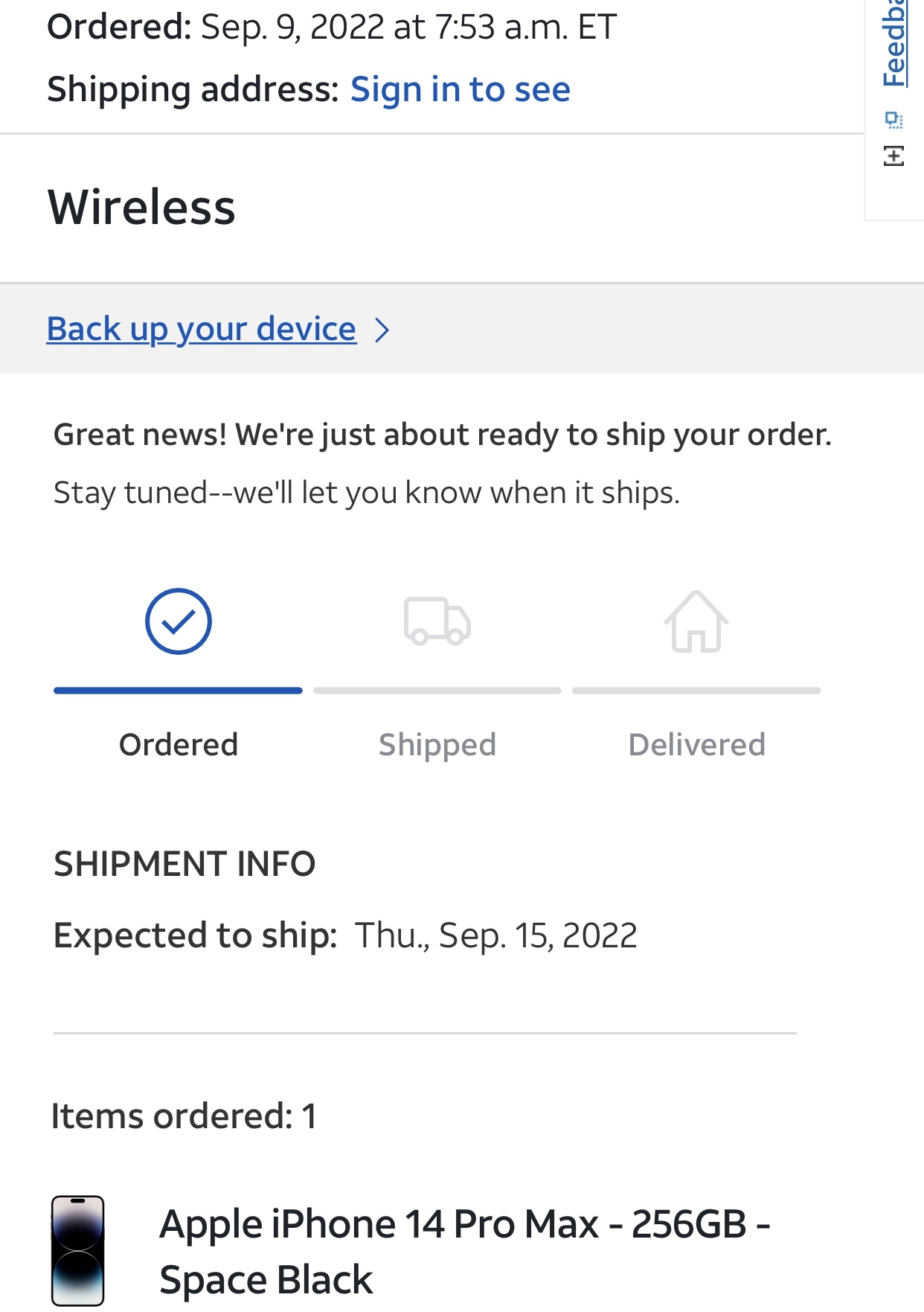Same. No changes and no fedex info. Not concerned, but it would be cool to start the shipping hype! lolWow. Nice! I don’t see anything on my FedEx app or on AT&T website. Just expected to ship Thursday 9/15