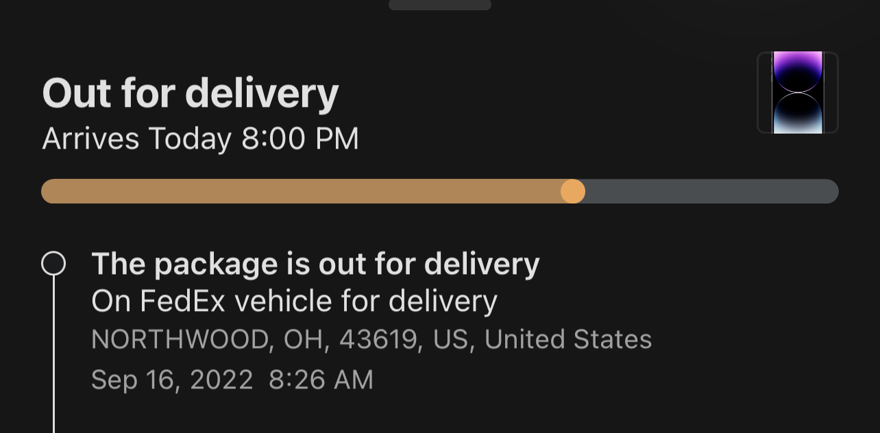 That happened to me last year with my 13 pro max and I didn’t get it until after the weekend on Monday.. ‘‘twas lame.So I have had tracking info since Monday and my ip14pro max has been sitting with fedex and status says At FedEx destination facility for 3 days and hasn't changed. Says it will get delivered today but another package being delivered today and it says on fedex vehicle for delivery. So I dont' have high hopes my iPhone will be here today.
