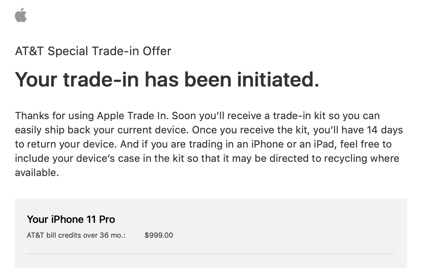 On the day preorders opened, I ordered a 128gb 14Pro and plan to trade in my 11Pro 64gb. At that time, going direct through ATT, I was given a trade in of $800, but going through the Apple site, I was told $999. All of my confirmation emails, texts, etc say $999, but ATT now says the trade in is $800 and Apple was wrong. Anyone else experiencing anything similar? I'm not sure what to expect and am worried, because ATT screwed me when I got my 11 Pro and traded in a perfectly good X.