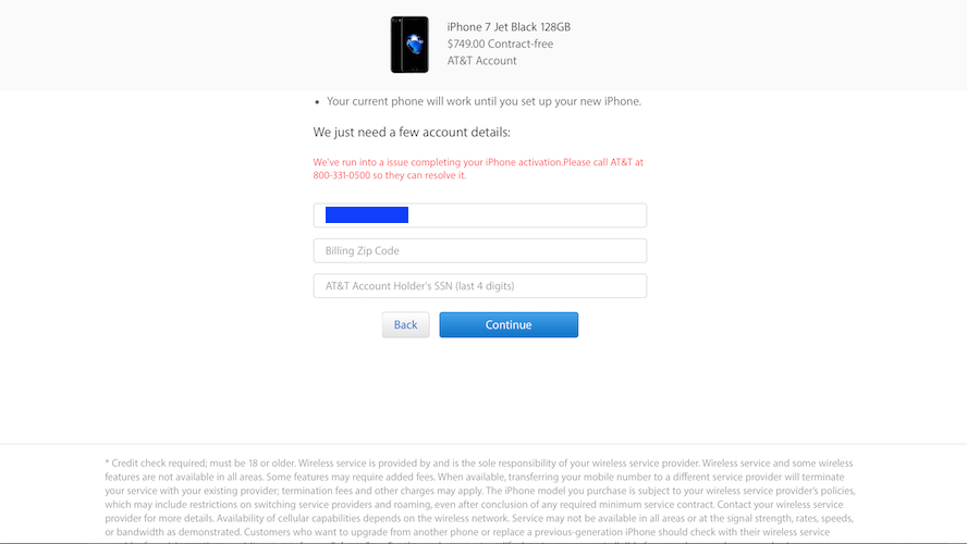 Hi I am new to preordering for my company through business premier ATT. SO is the reason I can't get through on the apple site because of our premier account? I get this message after trying to purchase through Apple's site (tried to order through ATT Premier site but estimated shipping date is after they release in the stores, going for a Jet Black 128):