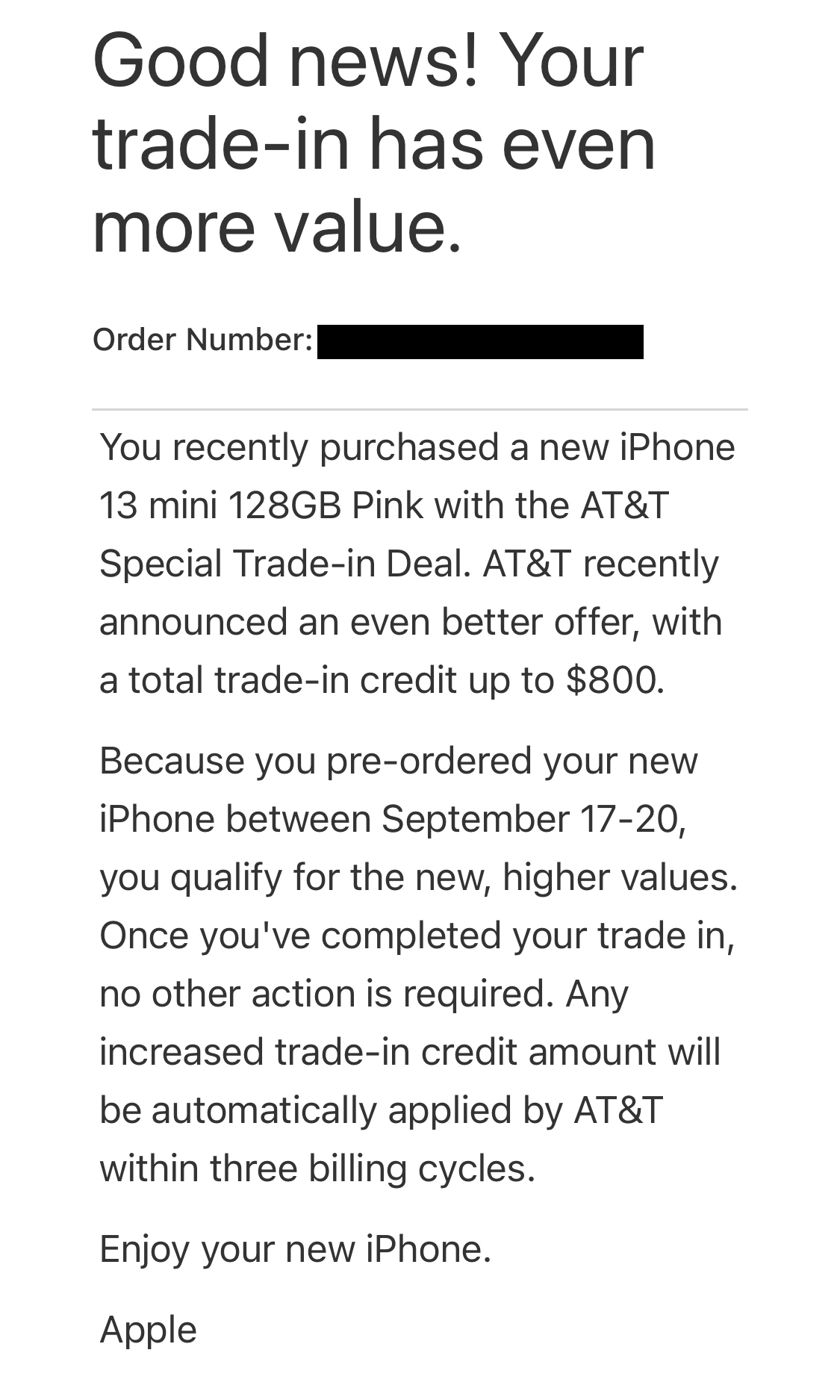 So, ordered a 13 Mini 128gb on day one (17th) ATT credit was $700 at that time. Like most people got that email from ATT stating that the trade in amount/promotion was now $800. For that I could have gotten the 256gb model with the offer, pretty crappy if you ask me for people that ordered over that first weekend. So here is the question; will they apply the remaining $100 to the monthly instalment credits or am I out that extra money. Or, do I have to cancel/return the first order and go to the back of the line to repurchase a 256gb model? Not sure if it's worth the hassle...