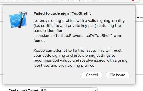 I just tried to update Provenance for the first time (loved in for the past 90 days) and it keeps saying it fails to code sign "TopShelf". Any ideas? I've also tried deleting the app and reinstalling, as well as using different names.