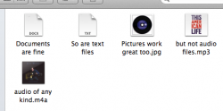 All the artwork shows up correctly in iTunes itself. However, when viewing the files themselves in Finder, there are no album art previews in the files. All other file types work just fine, even my movie and TV show files that are also in iTunes; only audio files don't have previews. (see first pic)