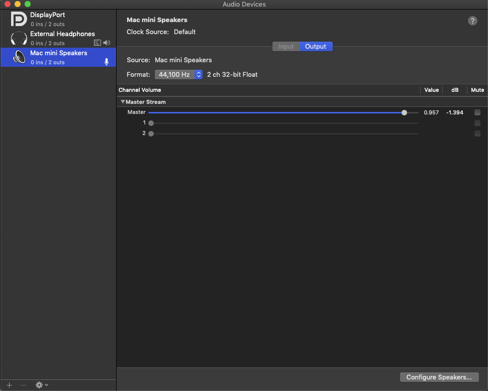 As for the Audio Midi, one thing that I didn't get in your reply is that you're talking about the Mac Mini speakers? (at least in your screenshot). I connect to the audio out, which as we know is headphones out, and that's what shows in my Audio Midi setup.