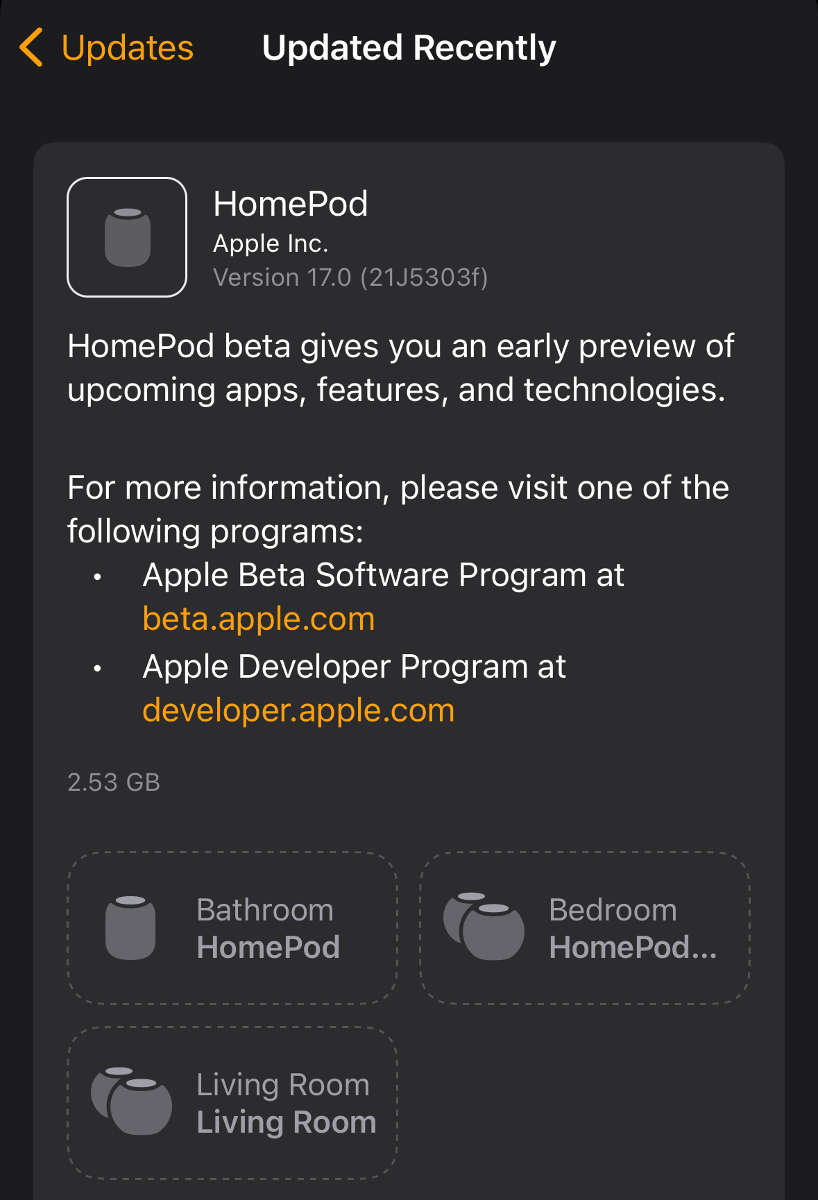 I’m unable to get the IOS 17 betas update on or in Home app. Stuck on the IOS 16.6 I have tried logging out of iCloud on all of my Apple items, rebooting, leaving some off while trying to update, etc. Just can’t get the Homepod Minis to update. All Apple items ATV 4K, IPad Pro, iPhone Pro, MAC Mini m1 are all on IOS 17 beta 3. I’m registered as a Public Beta tester.