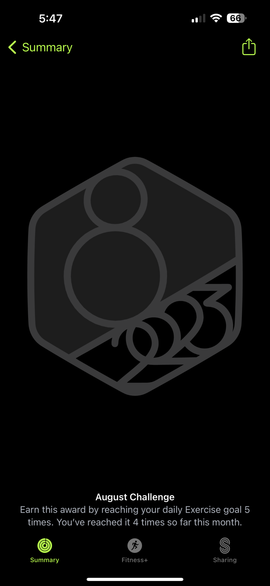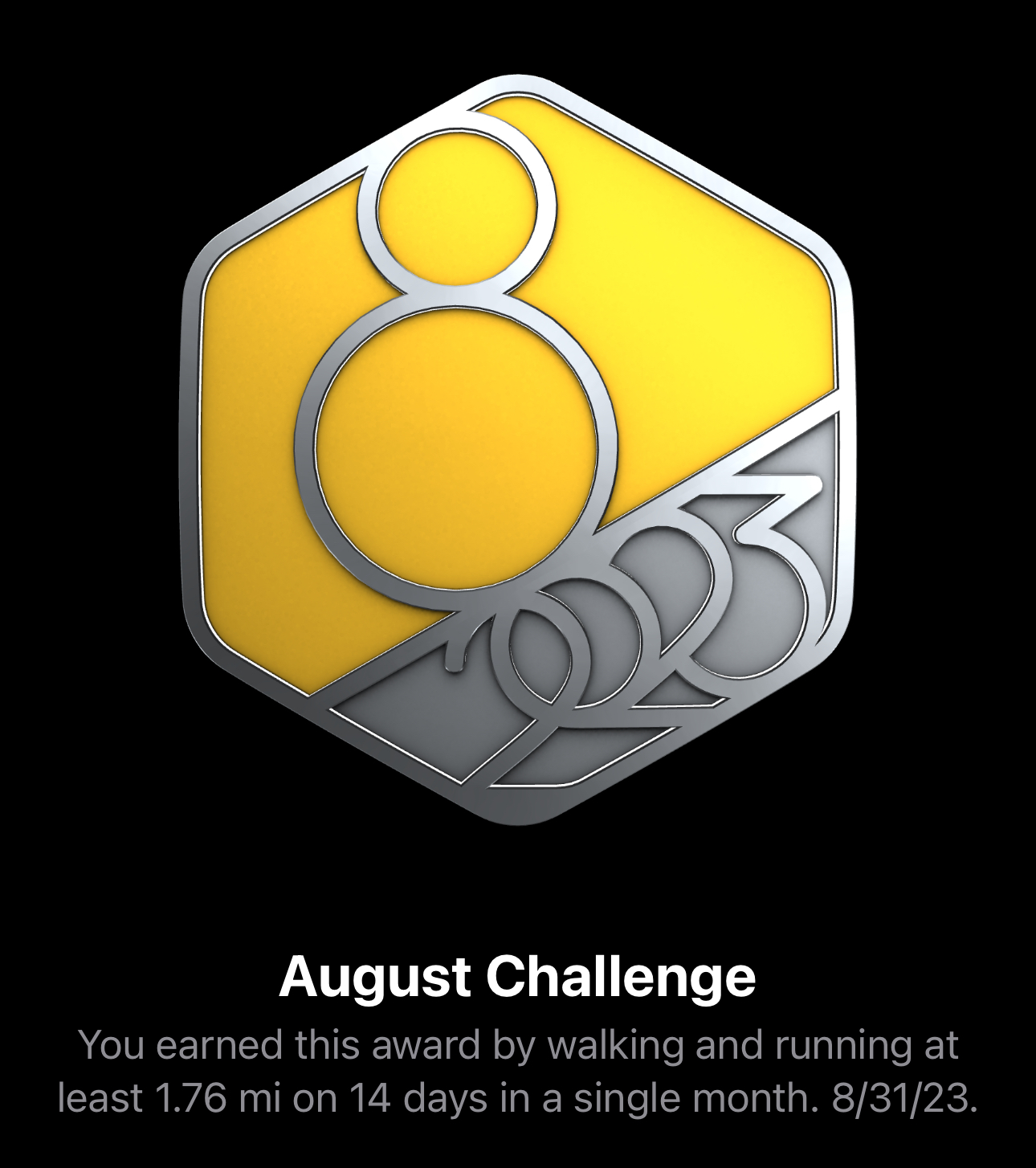 Completed on Saturday after three days biking to work last week which is 6 workouts then Saturday i walked the dog in the morning (getting drenched in the glorious English summer in the process!) then later that day another 3 mile walk after going to the football then to the pub, getting drenched again, to meet a mate back from Australia.Got the one this month that is 8 workouts of 5mins or more in the month. Days i bike to work will be two, one for each way, and as i biked in yesterday i've got two done already!