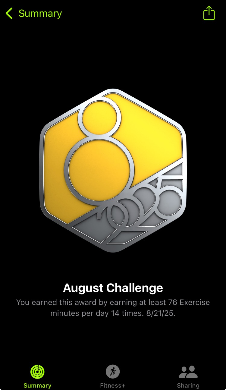 Made it on the 19th. Thank you, half-marathon training plan. Thank you, no overuse injury or illness from half-marathon training plan."Closing all 3 rings 19 times in a month? Boom. Hit that mark again to win this award."