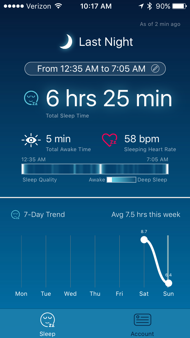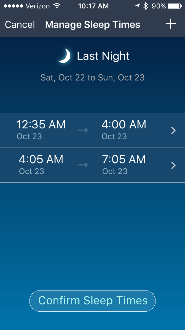 So, you get that little bar graph that gives you some indication of your restlessness. When you click on the total sleep time, that brings up the 2nd screen, where you can confirm/edit your sleep times. This is usually right on the money. last night I got up at 4 to use the bathroom and then woke up for good at 7:05 AM. It's really good at knowing when you're actually asleep versus just laying awake in your bed. I put my watch on DND and airplane mode overnight, along with turning off raise to wake, and i only get a 10-15% battery hit for a full night sleep. it's a pretty good app, and seems to be actively developed and getting better.