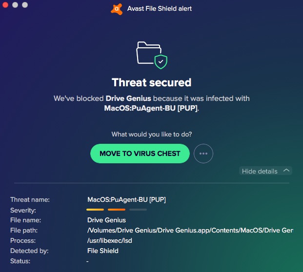 I have installed Avast on my MacPro on one bootable drive and it warns that Drive Genius 5.3.1 is infected by malware. I bought Drive Genius in the past. I get this message from Avast: