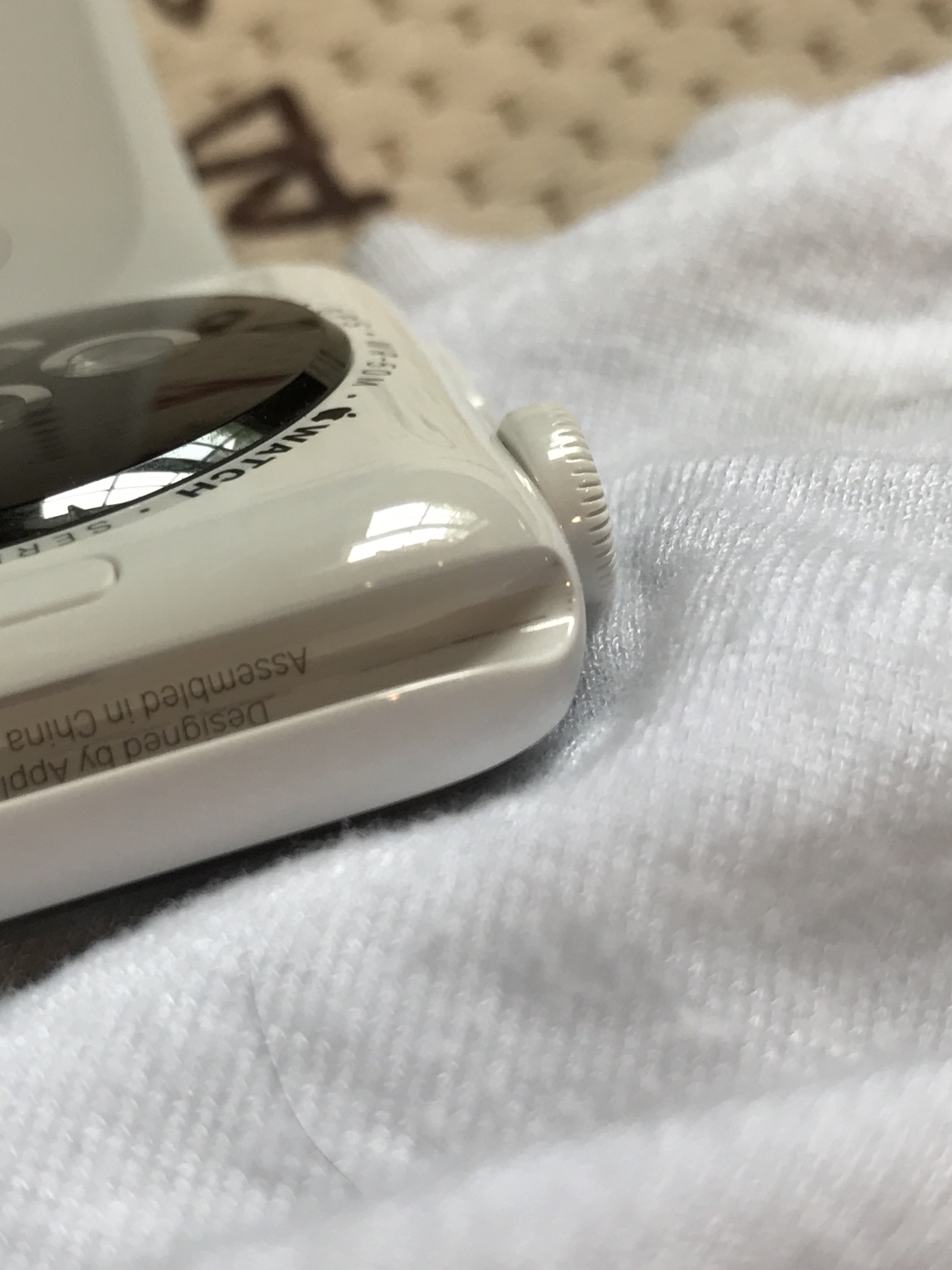 Quick question about my Ceramic edition. I have been switching bands between the Sport band and the blue leather loop. I noticed some dark marks along the inside of the watch where the bands connect to the watch. I cant seem to clean them off. I cant imagine they are scratches? I know they are mostly hidden, but curious if anyone else is seeing this?