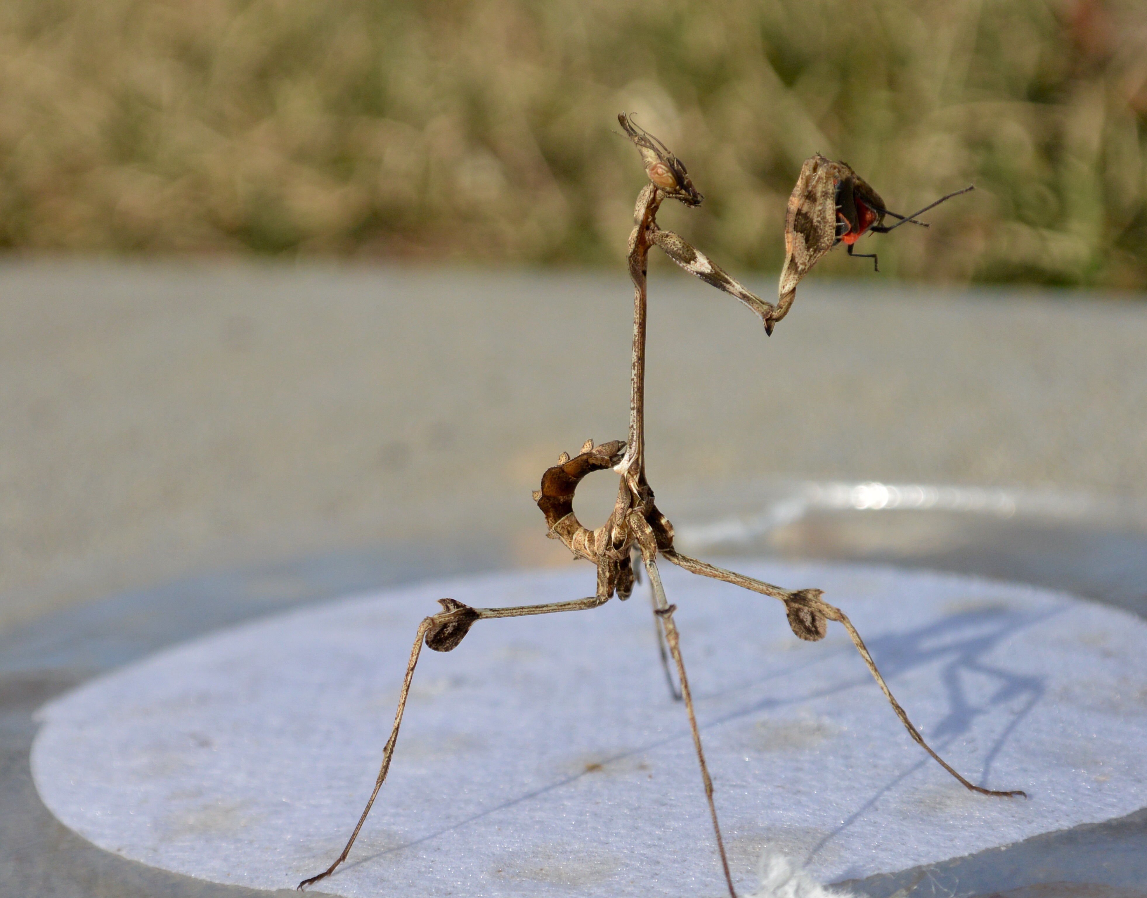 High-speed videos reveal that, unlike other jumping insects, the juvenile praying mantis does not spin out of control when airborne. In fact, it both creates and controls angular momentum at extraordinary speeds to orient its body for precise landings.