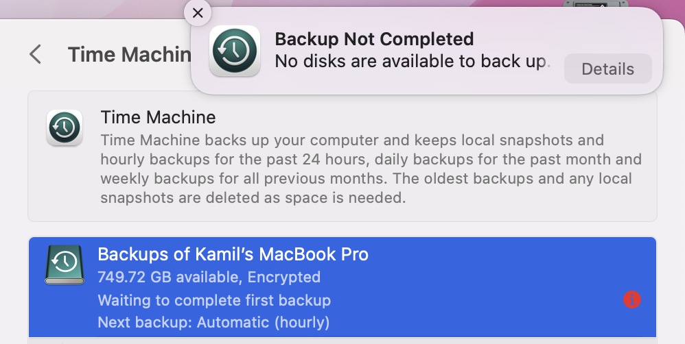 I'm trying to back up my data using external drive but notification pops up which says that drive is not available. What might be the problem?