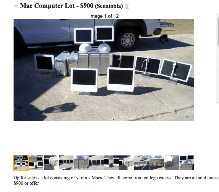 Ok, maybe for OBO. I work for a tech salvage company and we rarely get any value out of anything that can't run El Capitan or Sierra.Sure, assuming they're even working...however...you can't just make a blanket statement like that about the cinema displays. Even at $50 bucks a pop for everything in that picture, you're around $700. Dude isn't that far off base with OBO, imo. Maybe after it rots on CL for a while poster will realize. If I was in the area and had some playing cash, I'd throw an offer I thought was reasonable.