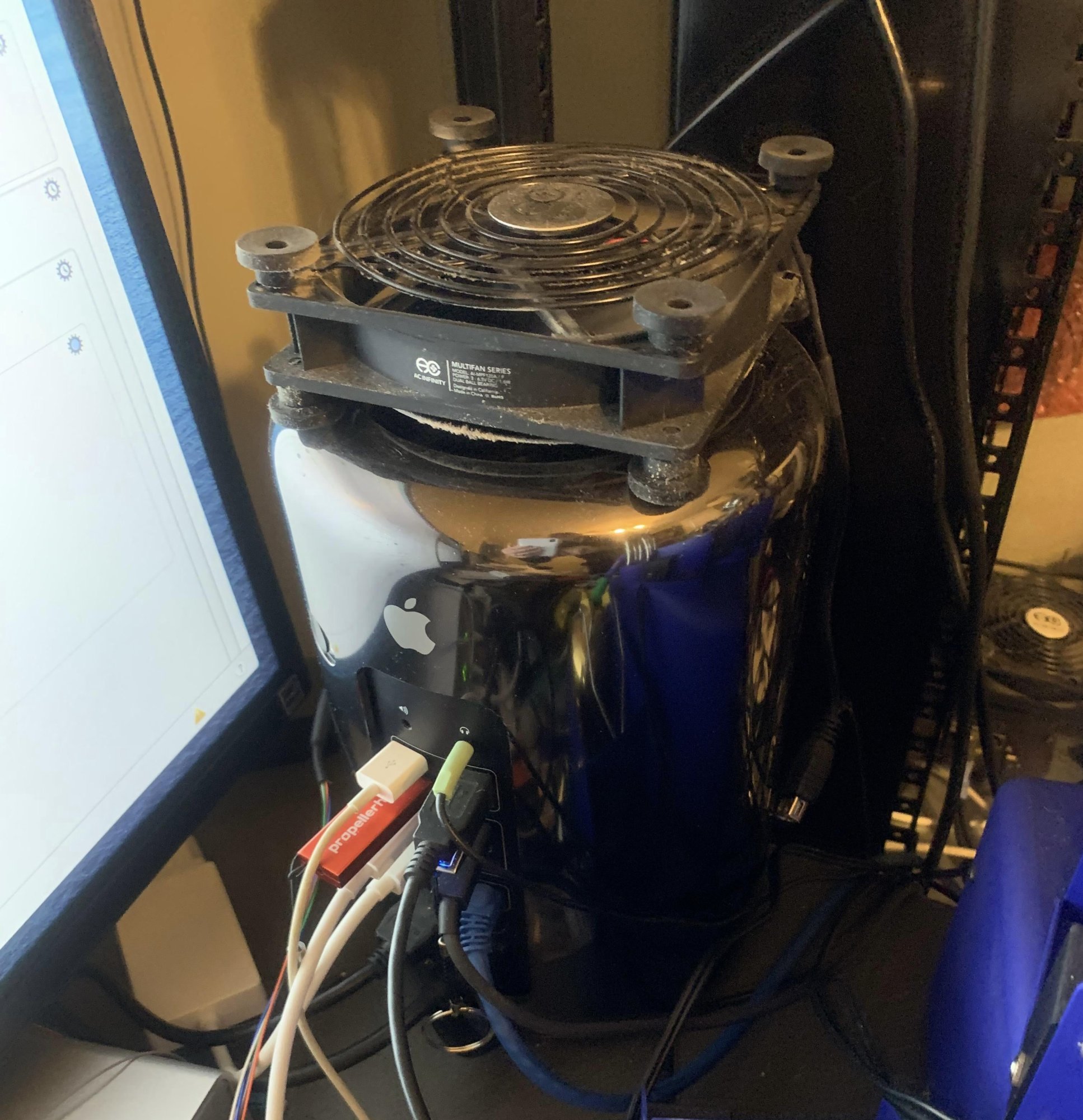 I had posted a photo with mine with a AC Infinity fan sitting perfectly on top ( the rubber on the screws sits perfectly on the trash can), and got roasted ( in typical Reddit fashion) with “why does it need it?”, “ if the Apple engineers thought it needed another cooling fan they would