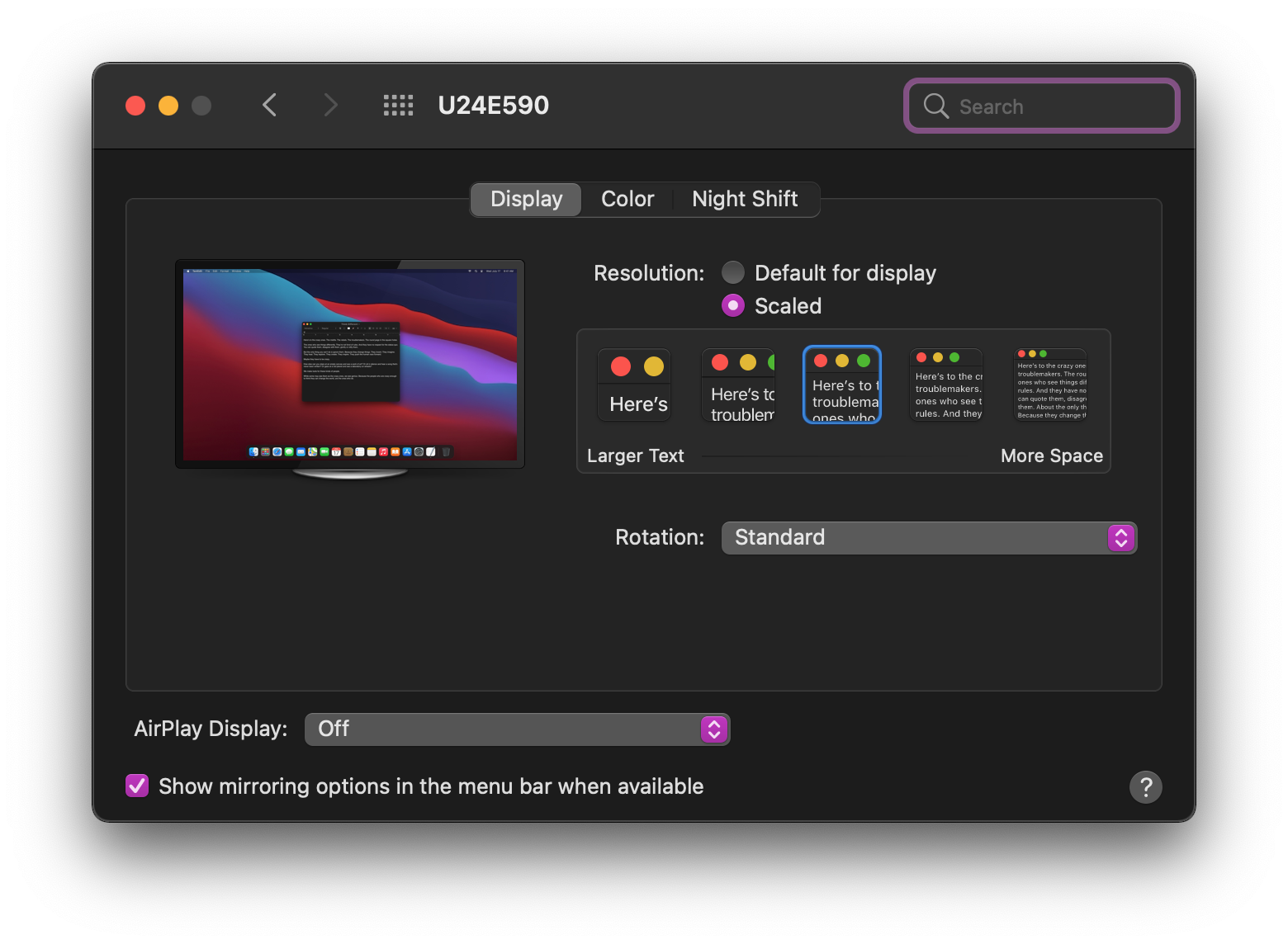 I'm also scaling the screen because the native res is too small for my older eyes, even with glasses. Native is 4k - I'm using 3840x2160, which is the next option the Mac gives me. I can't recall what the 2018 Mac mini gave me as an option, but I think it was a step between 4k and this, because this definitely looks weird to me (widgets, text too big). I can't tell if it's happening at native resolution... it's much smaller and harder to tell.