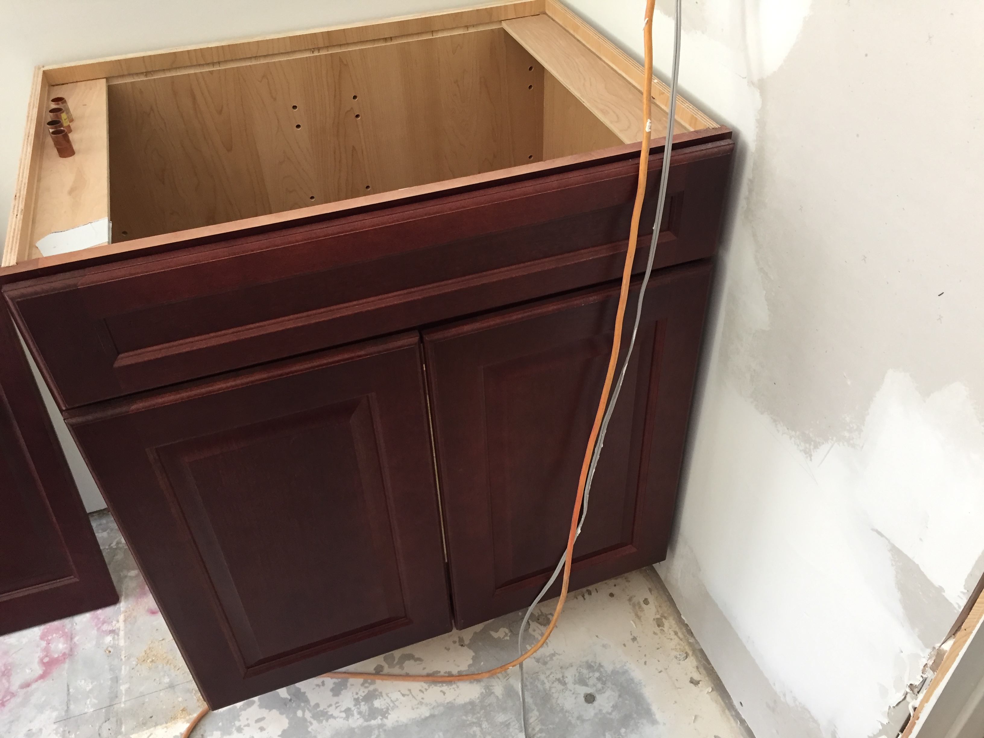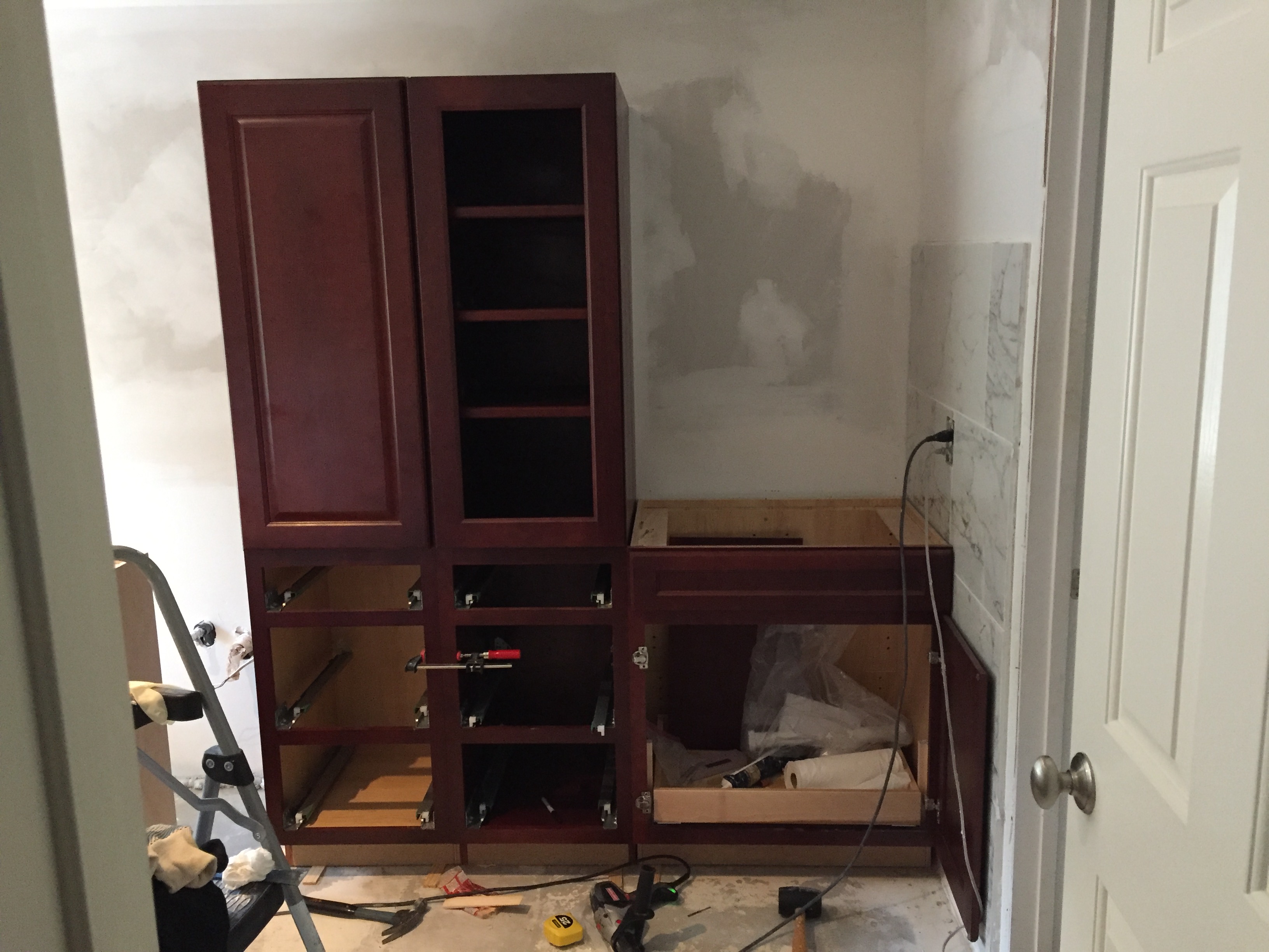 First of all where my cabinet butts into the wall, the door clearance is tight, so I’m going to put the tile on that wall first and then butt the cabinet into the tile. Otherwise, if I install the cabinet first snug against the wall, and then install the tile, next to the cabinet, the raised surface of the tile might impinge on the door opening against the wall.