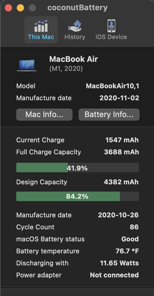 you may try to visit apple genius bar...they will read only their own report...but if its under 90% you should get a battery replacementOP here. Here's the latest reading... temp is 74F, coconutBattery is reporting 84.2%. Coming up on owning this for a year so I may visit Apple Genius bar for a potential battery replacement. Apples own Battery Health reports 89%.
