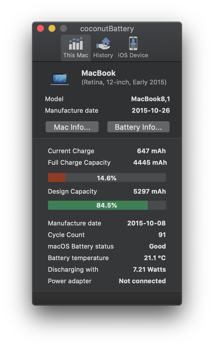 2015 Retina MacBook at 172 cycles but only 82% health. It has spent most of its life on A/C power.