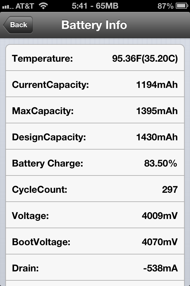 Here is a screenshot of my phone yesterday. After about an hour and a half it's already down to 65%. The phone is almost always warm to the touch. There's also a screenshot from BatteryDetective. Shows a lot of drain and battery temp. That's with nothing running in the background.