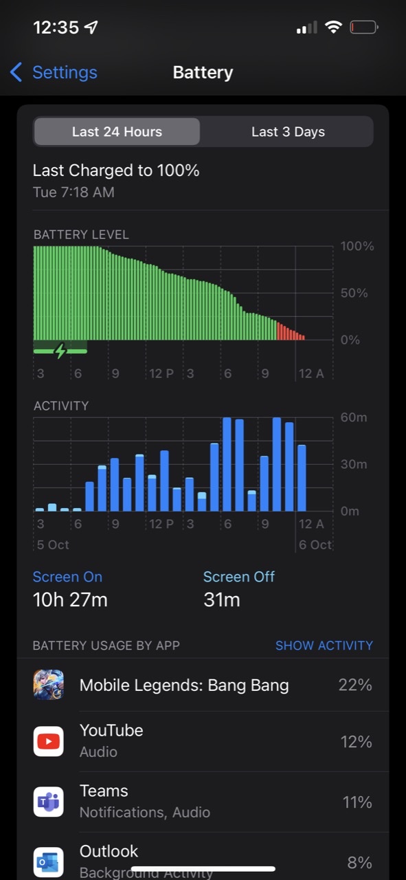 Getting around ~10.5 hours of screen on time, including gaming and YouTube… very impressive. 5% battery remaining. This is on a Pro (not Max).