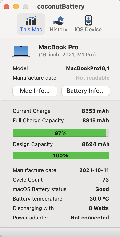 2022-04-22 07:03:35 100.14815 6084 6075 12 MacBookPro18,3 -- -- 0C512022-04-27 00:39:59 96.23045 5846 6075 15 MacBookPro18,3 -- -- 0C512023-04-20 00:36:38 94.23868 5725 6075 167 MacBookPro18,3 -- -- 0C51 2023-05-30 00:53:43 90.91358 5523 6075 190 MacBookPro18,3 -- -- 0C51 About 2 hours shorter on daily use at 82% now.