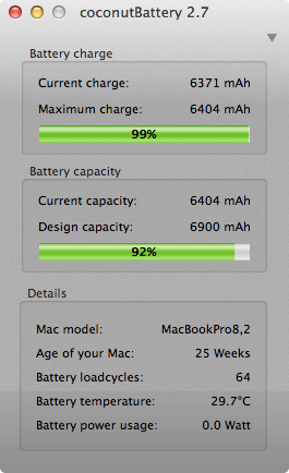 My previous laptops when new always had a battery capacity that exceeded design capacity by about 5%. After 9 months or so they'd hit the advertised capacity. This last computer was about 99% out of the box (bought in late Feb.) and is now at 92%. I'd like to hear what other people with 2011 MBP's say about this to find out if this is the new norm.