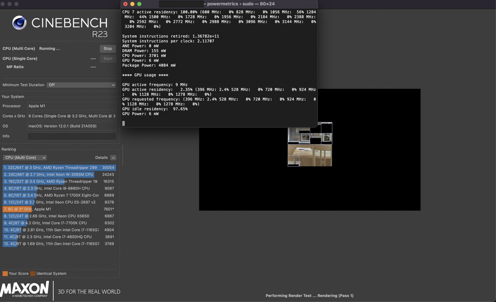 Finally here are both machines running the same Cinebench Multicore test, but in low power mode: