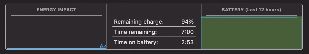 Yeah and that may or may not be an accurate estimate. I used to do a bunch of stuff and be surprised at how much battery was remaining. Now it's like my iPhone 8; runs down 1% every time I check. It just dropped to 92% in the last minute or 2. I'm literally getting Intel Mac battery life out of this thing now.Something definitely ain’t right, 7 hours remaining from 94% battery, doesn’t add up 🤔