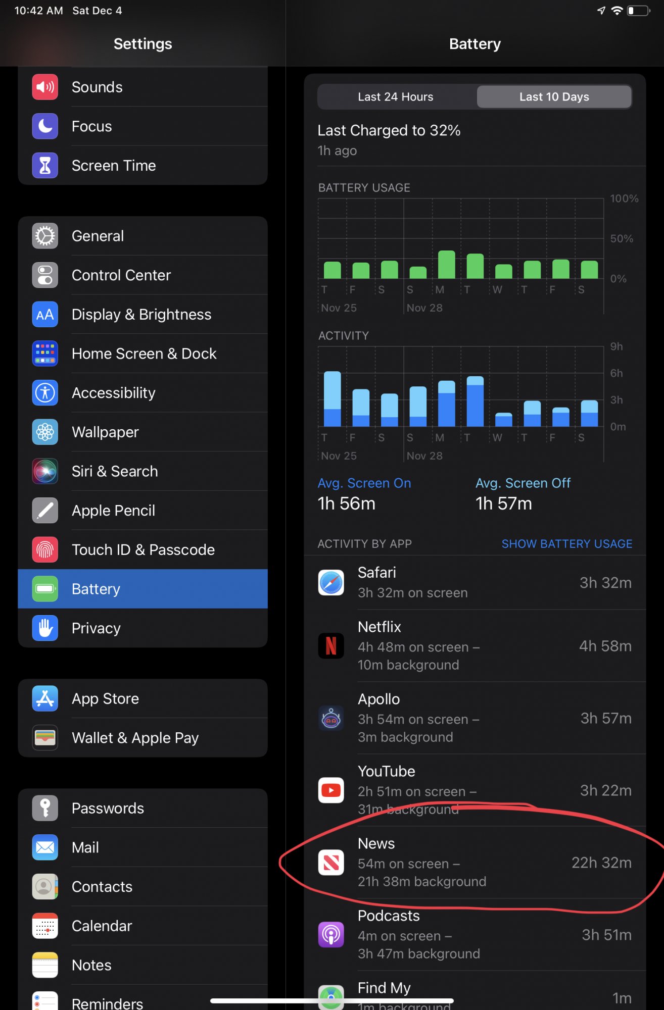 Yep, on my iPhone and iPad despite background data turned off and the app forced closed. Apple News is going nuts. Granted, it’s not using a TON of battery but definitely some. Didn’t do this before iOS / iPad OS 15.Anyone else seeing Apple News consuming an unnecessary amount of battery in the background? I removed the News widget to see if this helped, but it didn’t. I generally leave background app refresh on for all apps, as it hasn’t been a problem in the past, but just turned it off for News.
