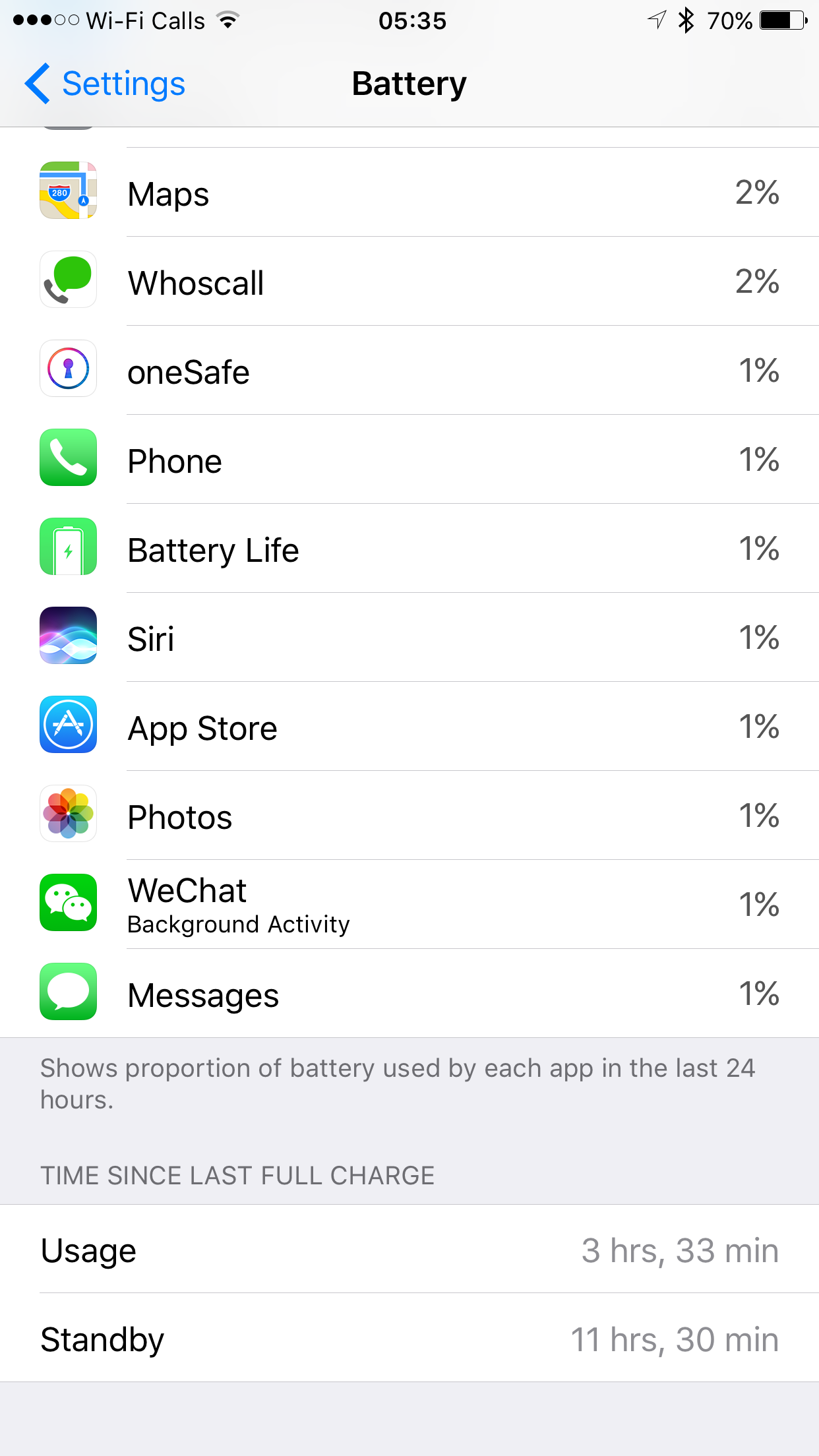 This is my one day use, off plug for about 12 hours, 3.5hours usage, and 70% remaining. BT always on and paired with my Apple watch. Wi-Fi always on no matter where I am. LTE always on regardless signal strength.