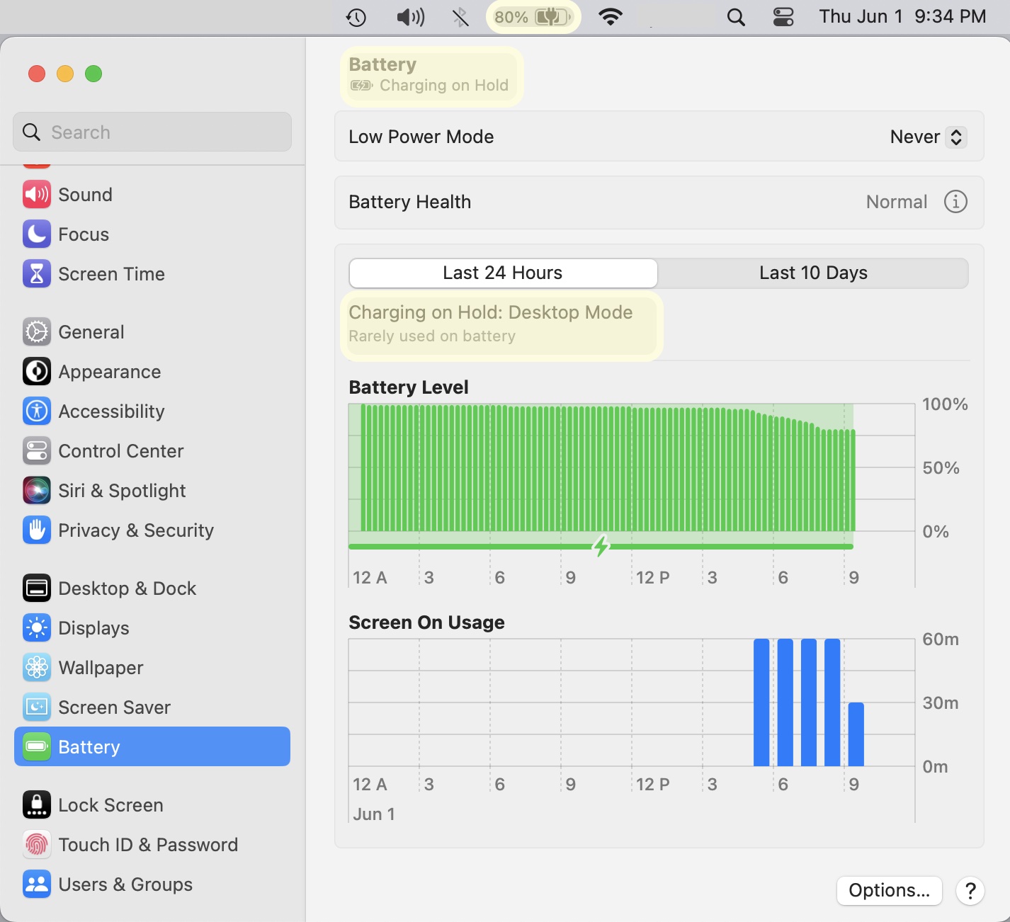 Have a 2021 MBP Max M1/64/1/32 on Monterey 12.6.5, with battery optimization enabled. It is always plugged in to my ASD through the black charging cable the ASD comes with.