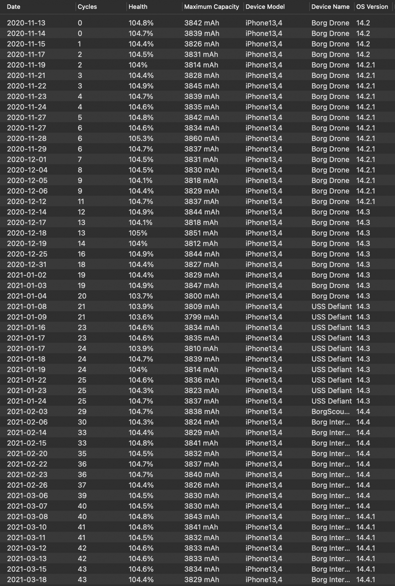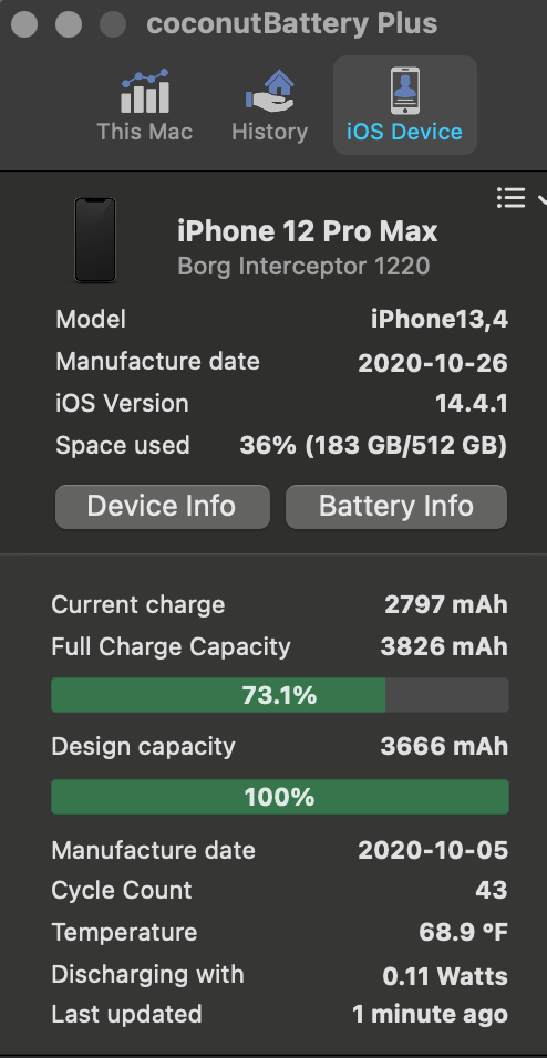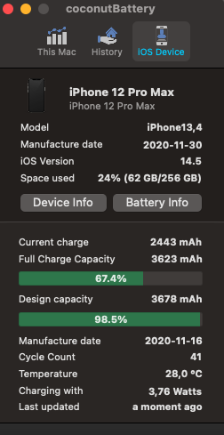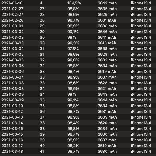 is that screenshot from coconut battery plus?Just remember, these phones come from the factory with all sorts of capacities. Some 104%, some 96%, some 108%. My 12 Pro Max is still 105% and my wife's phone is 104% from designed capacity. Someone who gets <100% design capacity from factory will see that % drop faster than those who don't. It's important to know where the phone started in order to understand it better. Apps like coconutBattery help in this respect.