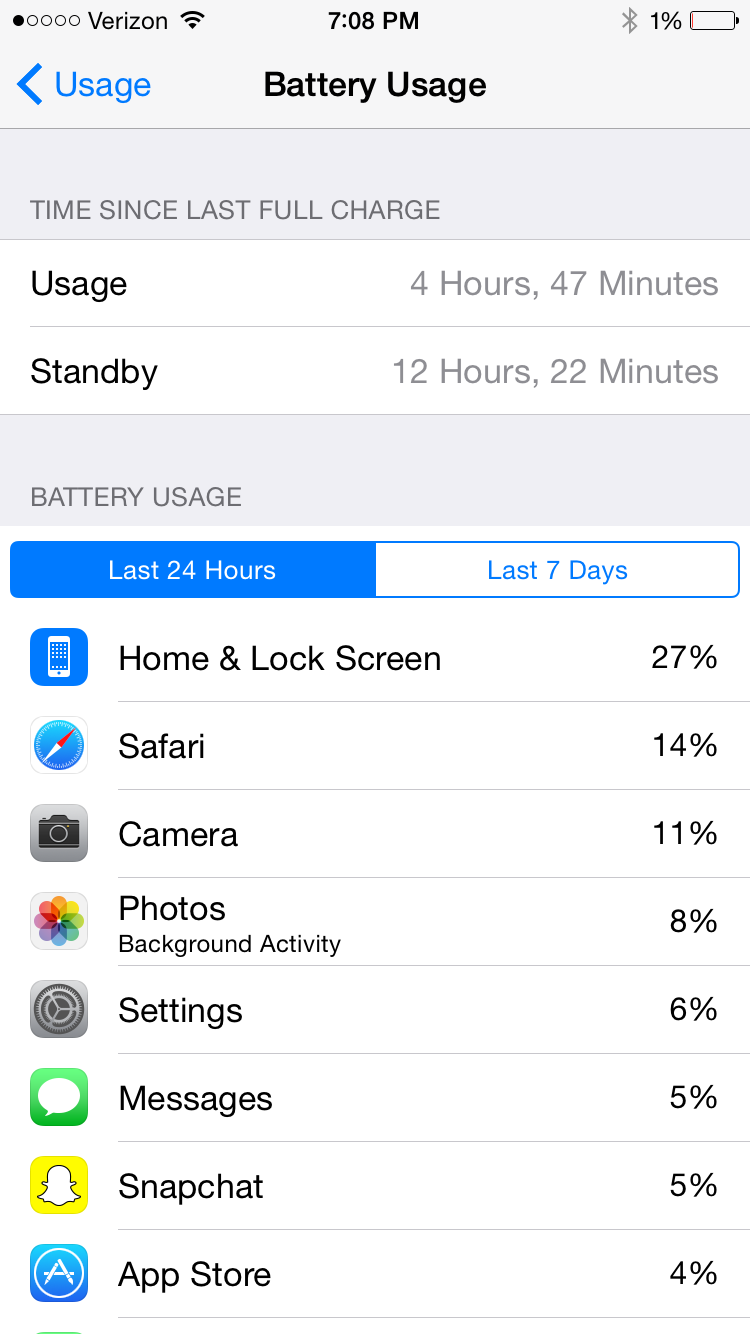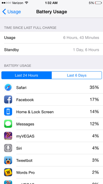 so this is where I'm at now. I can probably squeeze another 20 mins of use out of it. First time I tested this last week, I only saw just shy of 6 hours of use so yea it's s little better. I would really like to see 8 full hours. With all these people pegging friggin 10+, it makes me think something is wrong here. I have very few location services on, background apps off and one push iCloud email on and one manual exchange. I wonder if all these apps not being fully updated for iOS 8 is the root cause that some of us are having.