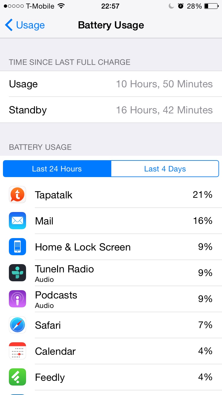 I have had my iPhone 6 for almost a week and a half and have never gotten more than 6 hours of usage. Right now it's 20% and I'm at 4 hours 45 mins so we will see how it goes. Extremely disappointed by my battery so far. I even have background refresh disabled, stripped location sevices to minimum, turned off push for email, it's fetch for only one of my 4 emails, manual for the rest. Brightness usually 25%. What's the deal?!